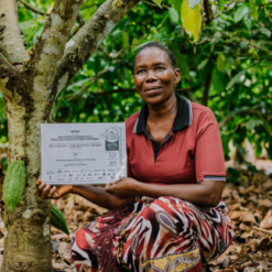 Sur la photo, Sarah Magmas tient le certificat « Cocoa of Excellence » décerné chaque année aux meilleures fèves de cacao au monde.